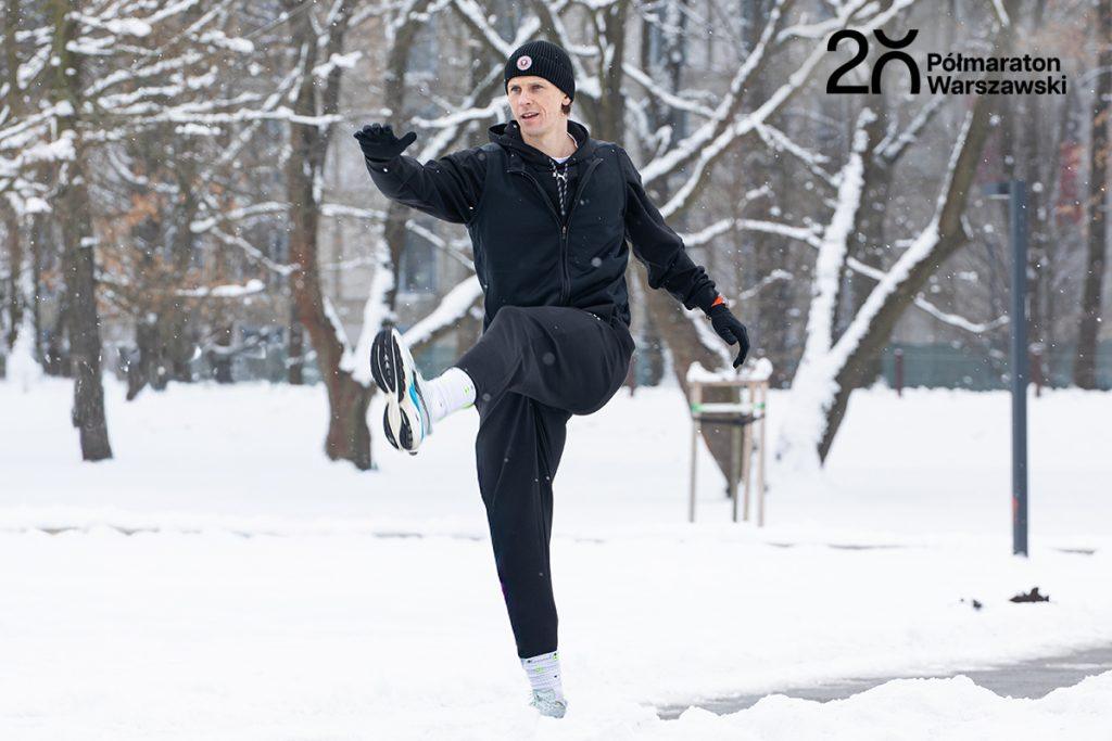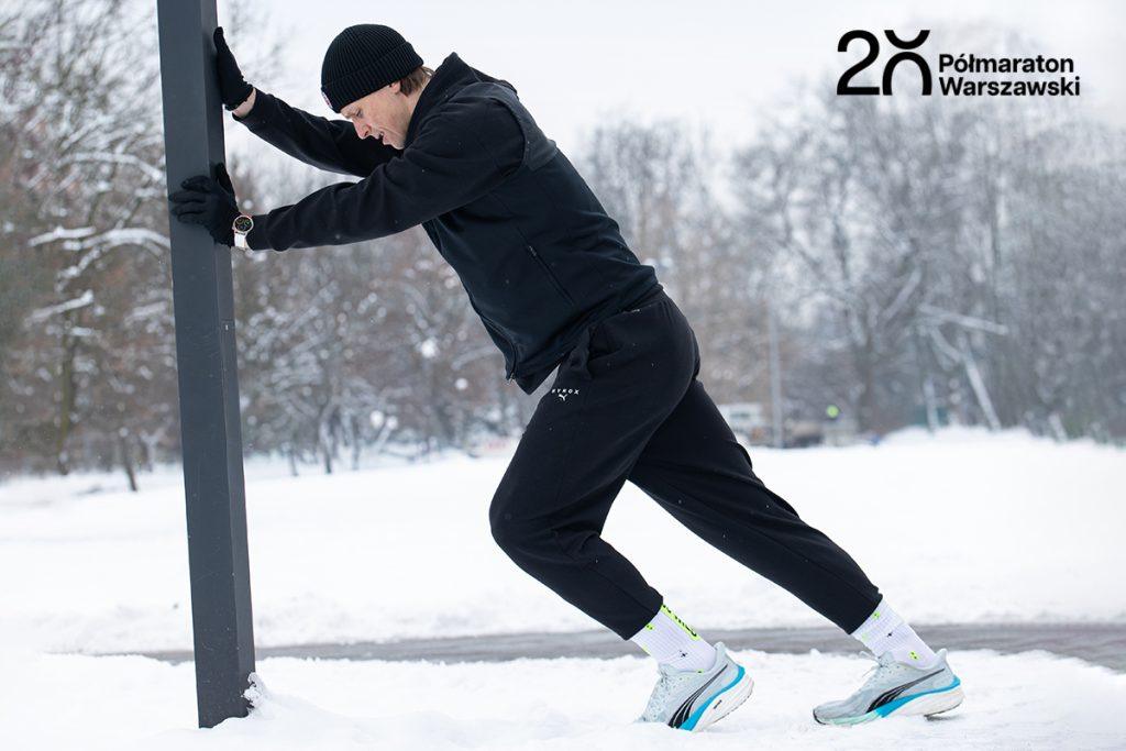 ● Rozgrzewka: Zacznij od 5 km spokojnego biegu (niech tętno nie przekracza 75% Twojego maksa). Potem zrób ćwiczenia, które “przygotują” Twoje ciało do mocnego wysiłku i które powtórzysz w dniu startu: wymachy nóg, dynamiczne przysiady, krążenia rąk. Według badań (International Journal of Sports Physical Therapy), taka dynamiczna aktywacja może wpłynąć nie tylko na ekonomię biegu, ale też na subiektywne odczucia dotyczące wysiłku – będzie Ci się po prostu biegło lżej [3].
